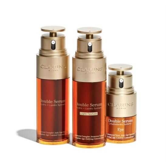 Clarins' Double Serum her zaman ikonik bir cilt bakım ürünü olmuştur, şimdi yeni hafif ve fark edilmeyen dokusuyla birlikte yaşlanma belirtilerine karşı kanıtlanmış sonuçlarla sunulmaktadır. Clarins Research tarafından geliştirilen çift fazlı formülü, cildin beş hayati fonksiyonunu güçlendirmeye yardımcı olan en az 21 güçlü bitki özü içerir: yenilenme, beslenme, oksijenlenme, nemlendirme ve koruma ve yaşlanma belirtilerine etki etme. Kaybolan bir yağ ve eriyen bir jelden oluşan ikili doku, ciltte anında 'çıplak bir cilt' görünümü bırakır ve meyveli, çiçeksi, taze ve narin notalarla hoş bir kokuya sahiptir.
