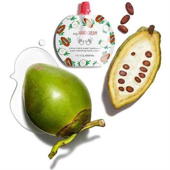 My Clarins My Hand Cream, ellerinizi derinlemesine beslemek için organik hindistancevizi yağı, hindistancevizi suyu ve kakao yağı ile zenginleştirilmiş doğal, çevre dostu içeriklerden oluşan lezzetli bir kokteyldir. Çevre dostu bu krem, elleri yoğun bir şekilde nemlendirirken, tırnaklarınızı da güçlendirmeye ve beslemeye yardımcı olur. Yoğun nem ve besleme için %88 doğal kökenli içerik ve %15 kakao yağından yapılmıştır. Organik boabab yağı tırnakları güçlendir ve tırnak etlerini korur. Yapısında bulunan bitki bazlı bileşenler sayesinde, hücre beslenmesini geri kazandırırken kirliliği de cilt hücrelerinden dışarı atmaya yardımcı olur.