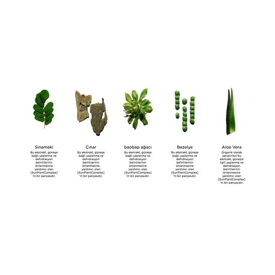 - Bitkisel özlerle zenginleştirilmiş antioksidan formül, foto yaşlanmaya karşı savaşır.
