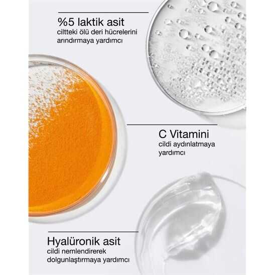- Aydınlık ve Canlı Cilt: Cilt yüzeyini yeniler, daha parlak bir görünüm kazandırır. Laktik asit ile cilt yüzeyinizi yenilerken, C vitamini ile aydınlatılmış bir görünüm elde edersiniz.