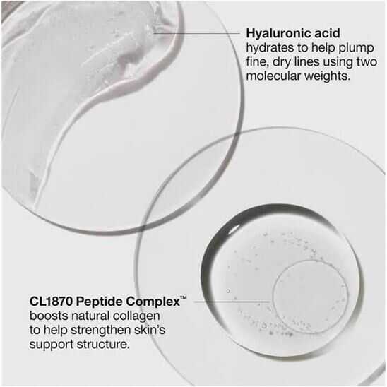 Hyaluronik asit: Özel formül, iki moleküler ağırlıkta hyaluronik asit kullanır. Bu yoğun nemlendirici, cildinizi nemlendirmeye yardımcı olur ve tutar. Esnekliği geri kazandırmaya ve ince, kuru çizgileri gözle görülür biçimde pürüzsüzleştirmeye yardımcı olur.