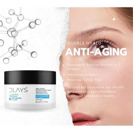 Dlays Double Hyalu Collagen Filler Yaşlanma Karşıtı Nemlendirici üç farklı boyutta Hyaluronik asit içerir, cildi güçlendirici, dolgun, esnek ve belirgin şekilde daha pürüzsüz bir görünüm için cildinizi nemlendirir, canlandırır ve dolgunlaştırır. Hyalüronik Asit, Collagen, Niasinamid, Bezelye Ekstratı ve E vitamini içerir. Kolojen peptitleri ile cilt yaşlanmasının etkilerini azaltmayı ve onarılmasını destekler. Krem dokusu cildi gözle görülür bir şekilde dolgunlaştırmaya ve sıkılaştırmaya yardımcı olur. Yaşlanma etkilerini geciktirir.